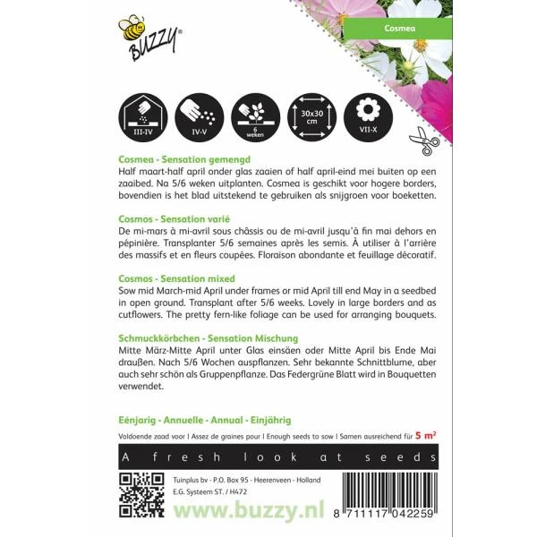 Cosmos Sensation. Dit eenjarige Cosmea-mengsel vormt fraaie hoge planten (100-120 cm) welke sublieme snijbloemen geven in rose, rood en wit. De enkele bloemen zijn opvallend groot. Heel mooi in de border en fantastisch in de vaas, het blad is zeer geschikt als ‘snijgroen’.