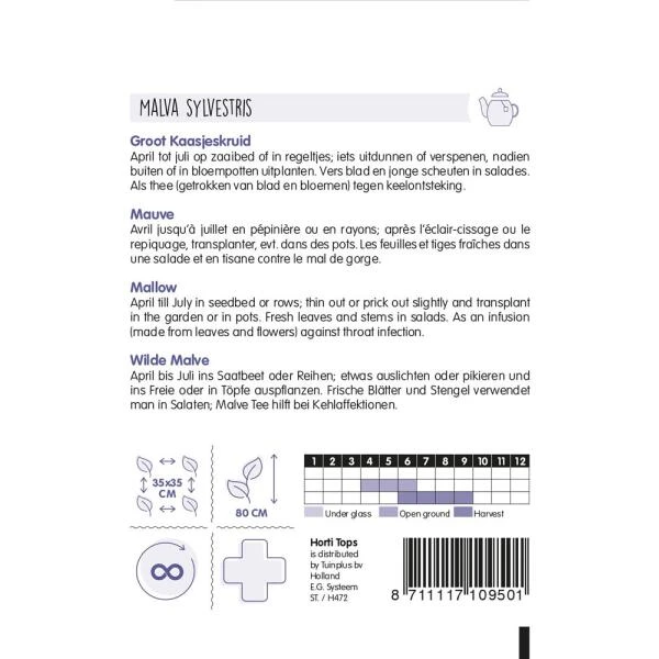Groot kaasjeskruid – Malva sylvestris. Gebruik het verse blad en de jonge scheuten in salade. Malva thee (blad en bloemen) helpt tegen keelontsteking. Malva is een doorlevende vaste plant met paarse bloemen en een hoogte van ongeveer 80 cm.